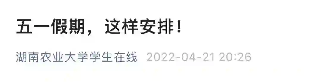 同日,微信公号“湖南农业大学学生在线”发布五一劳动节假期安排:4月23日-5月8日期间周末正常休息,5月2日-6日正常上班上课。清明节、五一劳动节的补休均计入暑假。