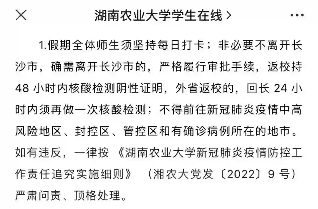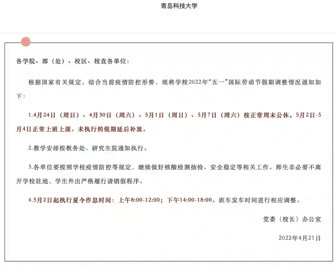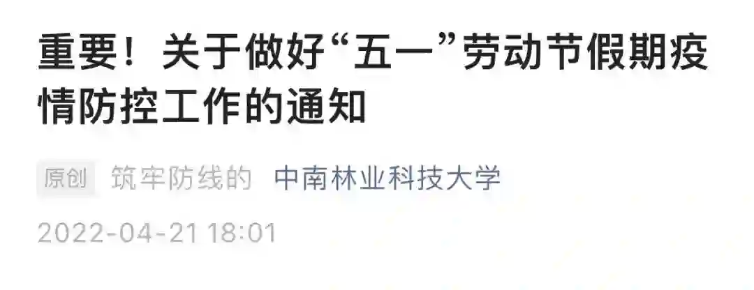 4月21日,中南林业科技大学发布《关于做好“五一”劳动节假期疫情防控工作的通知》。文中提到:4月22日至5月8日期间周一至周五正常上班、上课,周六、周日休息(具体教学安排由教务处、研究生院另行通知),“五一”劳动节法定节假日调整至暑假补休。