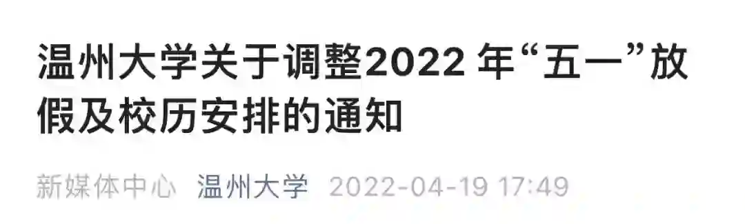 4月19日,温州大学发布《关于调整2022 年“五一”放假及校历安排的通知》,其中称:五一劳动节假期不调休。5月2日(星期一)至5月6日(星期五)正常上班上课,双休日照常休息。5月1日法定假日休息,安排在2022年暑假补休。