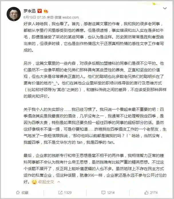 最后,他表示:“企业家的独断专行和帝王思想是毫不相干的两件事,我相信智力正常的锤科同事都不会认为我有什么帝王思想,虽然我确有比较严重的精英思想。”