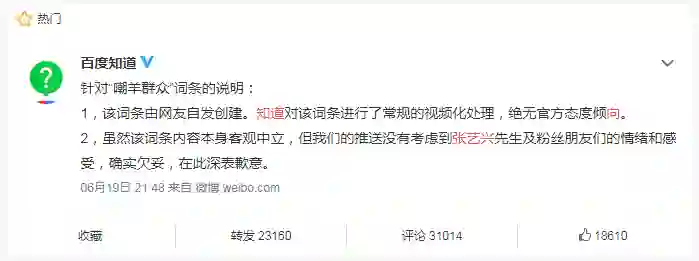 针对百度平台对“嘲羊群众”的所有相关词条和投放,6月19日晚上,@张艺兴工作室 发表声明要求百度平台立即撤销,并郑重道歉,并称这是恶意的集体霸凌。