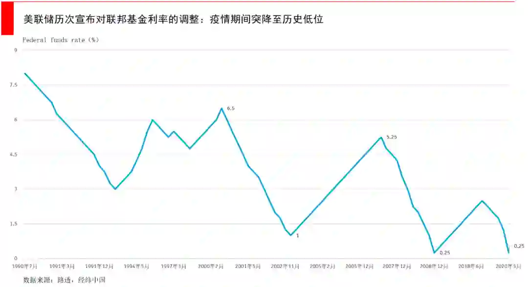 疫情期间全球降息了67次,特别是美联储多次降低了美国联邦基金利率(Federal funds rate),这个利率在金融市场很重要,因为证券估值时有一个折现率,直接跟它有关,现在这个“锚”已经到达了历史最低水平。