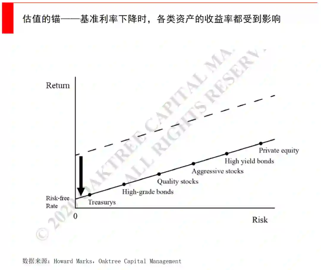 对于各类资产来说,风险-收益排序可以看下图,最底层的基石就是国库券(Treasurys,它的定价基于上文说的联邦基金利率),当美联储在今年疫情后降低了这一无风险利率后,就改变了所有预期收益,通常来说,起点越低,所有资产的预期收益就越低。