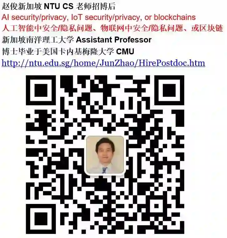 简要介绍:赵俊老师博士毕业于美国卡内基梅隆大学 PhD degree from Carnegie Mellon University (CMU), USA,博士期间所属实验室为CMU CyLab Security & Privacy Institute,博士导师为Virgil Gligor (Inductee of the USA National Cyber Security Hall of Fame) and Osman Yagan, 合作者为Adrian Perrig。博士后期间指导老师为Xiaokui Xiao, Junshan Zhang, Vincent Poor。本科毕业于上海交通大学,目前为新加坡南洋理工大学Assistant Professor。研究方向为人工智能/深度学习中安全/隐私问题,区块链,物联网中安全/隐私问题,社交网络中安全/隐私问题。