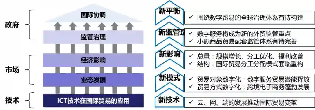 一是新技术。信息通信技术将成为生产制造、交通物流、跨境支付外又一个对国际贸易影响重大的技术,其不仅提升了国际贸易效率,更是重塑了国际贸易的生态。