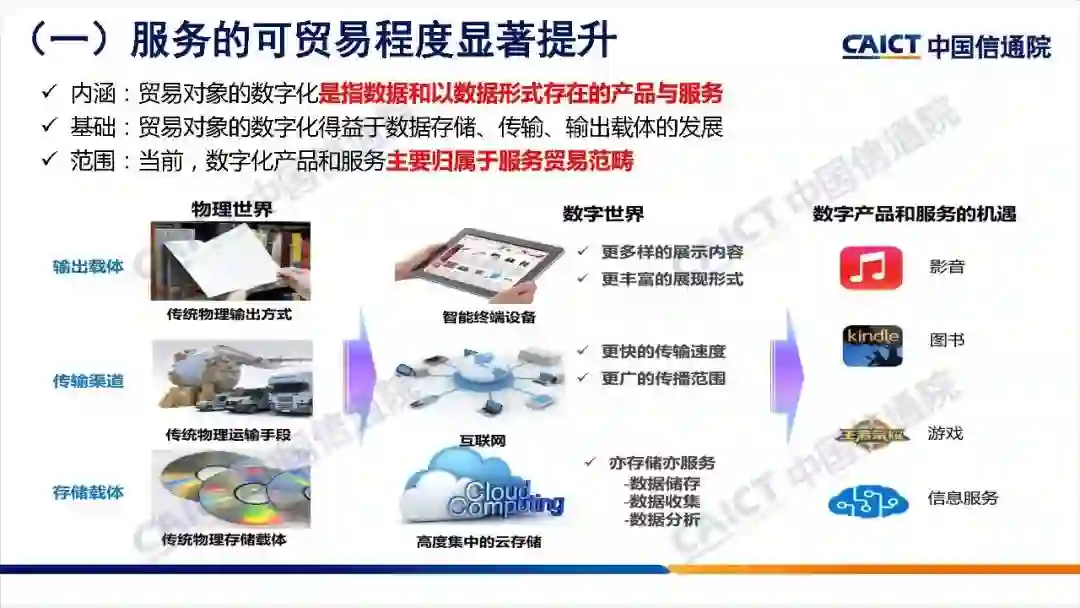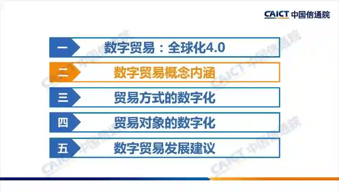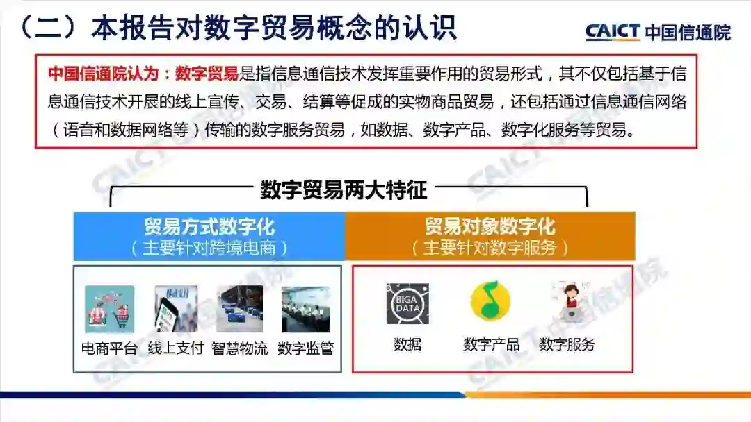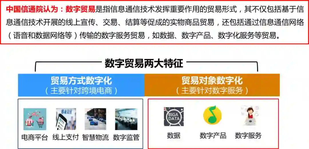本白皮书认为,数字贸易是指信息通信技术发挥重要作用的贸易形式,其不仅包括基于信息通信技术开展的线上宣传、交易、结算等促成的实物商品贸易,还包括通过信息通信网络(语音和数据网络等)传输的数字服务贸易,如数据、数字产品、数字化服务等贸易。