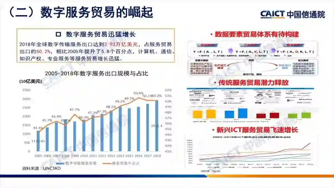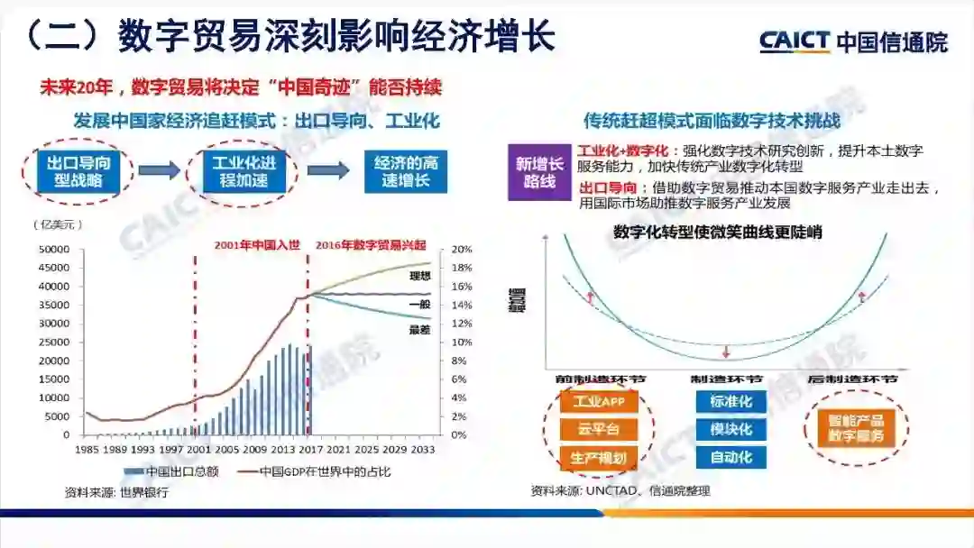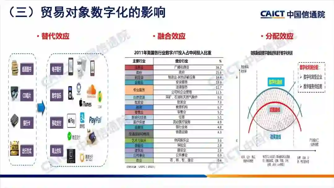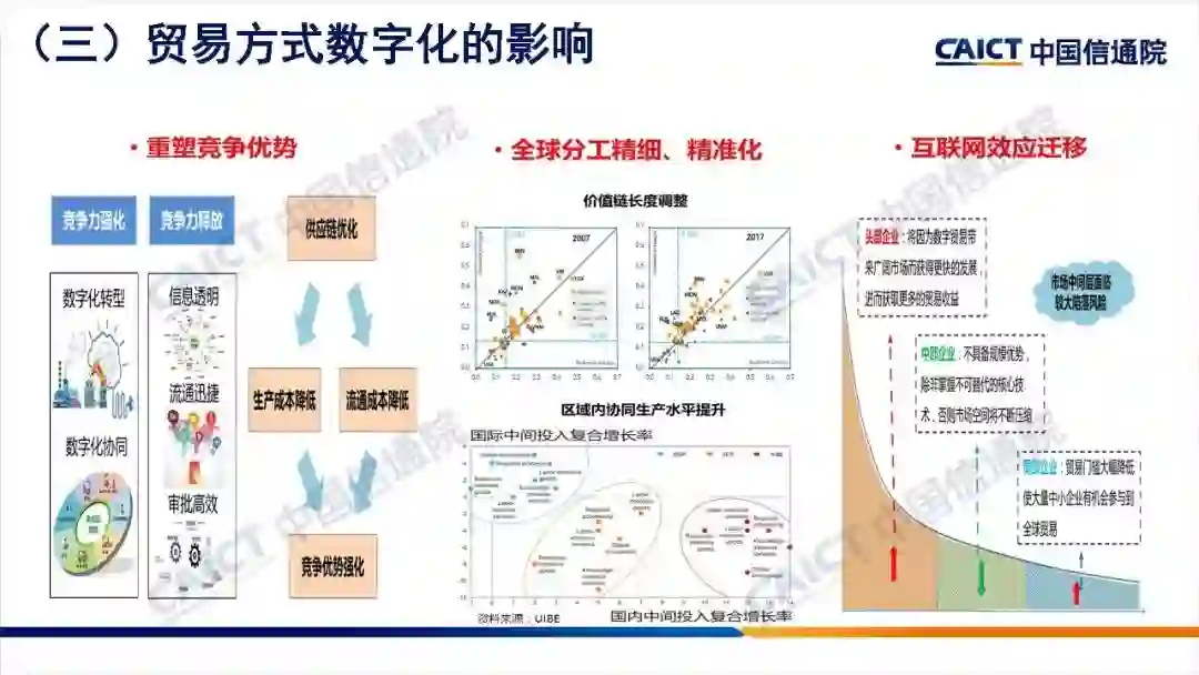 三是新影响。从总量上来看,信息通信技术使得贸易规模扩张、分工优化,消费者福利得到进一步改善。从结构来看,国际贸易的分工、分配模式都会因为贸易方式和贸易对象的变化出现新的变化。