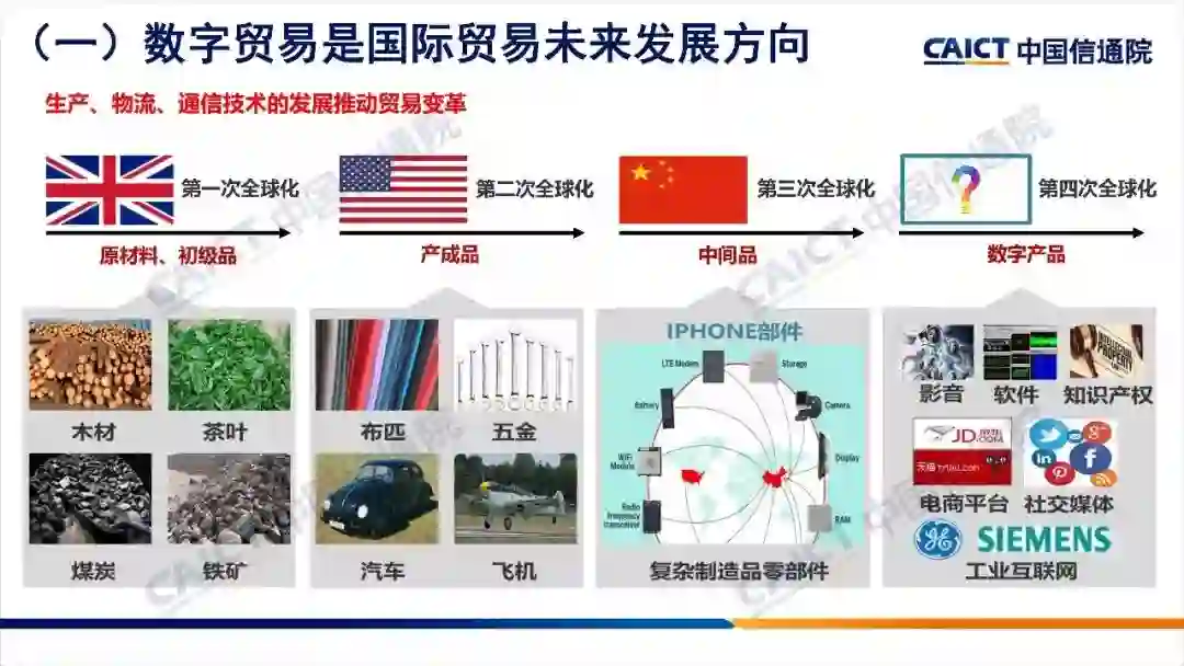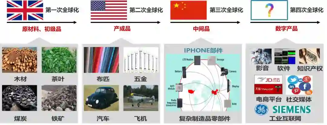 从哥伦布发现新大陆起,人类进入了全球化时代。第一次全球化,地理局限的突破使得全球贸易成为可能,人们开始对有限的初级产品开展贸易;第二次全球化,一、二次工业革命的到来极大地提高了生产力,工业制成品贸易大幅增长;第三次全球化,以国际组织和规则为基础的国际治理体系日益完善,推动国际分工进一步深化、细化,中间品贸易开始兴起;第四次全球化,数字经济的发展使得国际间经济关系从物理世界转向了数字世界,以信息交互为基础的跨境电子商务蓬勃发展,以及数据和数据形式存在的产品和服务贸易快速增长。