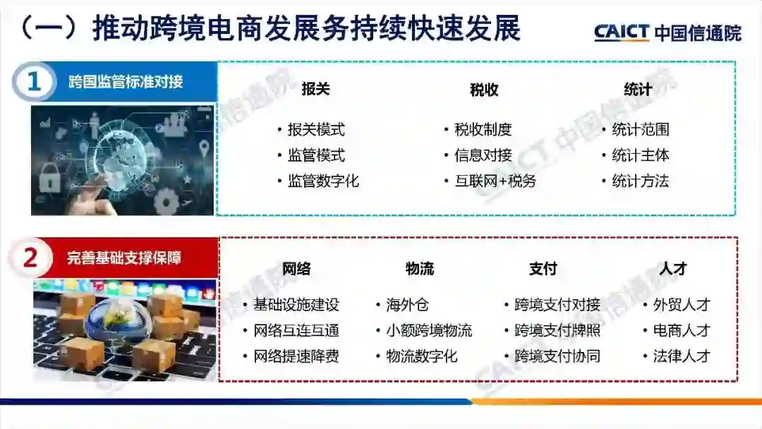 一是推动跨境电商发展务持续快速发展。强化监管标准对接在WTO等国际组织的标准和协商体系下推动各国海关监管标准的统一,如报关、税收。完善基础支撑保障,提升网络、物流、支付、人才等基础能力。