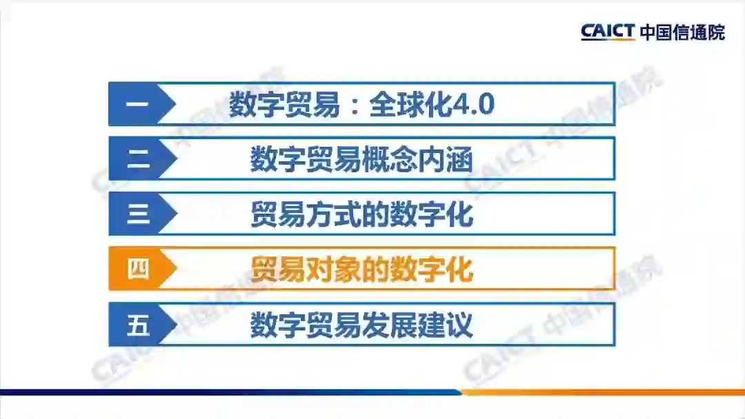 数字贸易两大特征分别是贸易方式数字化和贸易对象数字化。其中,贸易方式的数字化是指信息技术与传统贸易开展过程中各个环节深入融合渗透;贸易对象的数字化是指数据和以数据形式存在的产品和服务贸易。