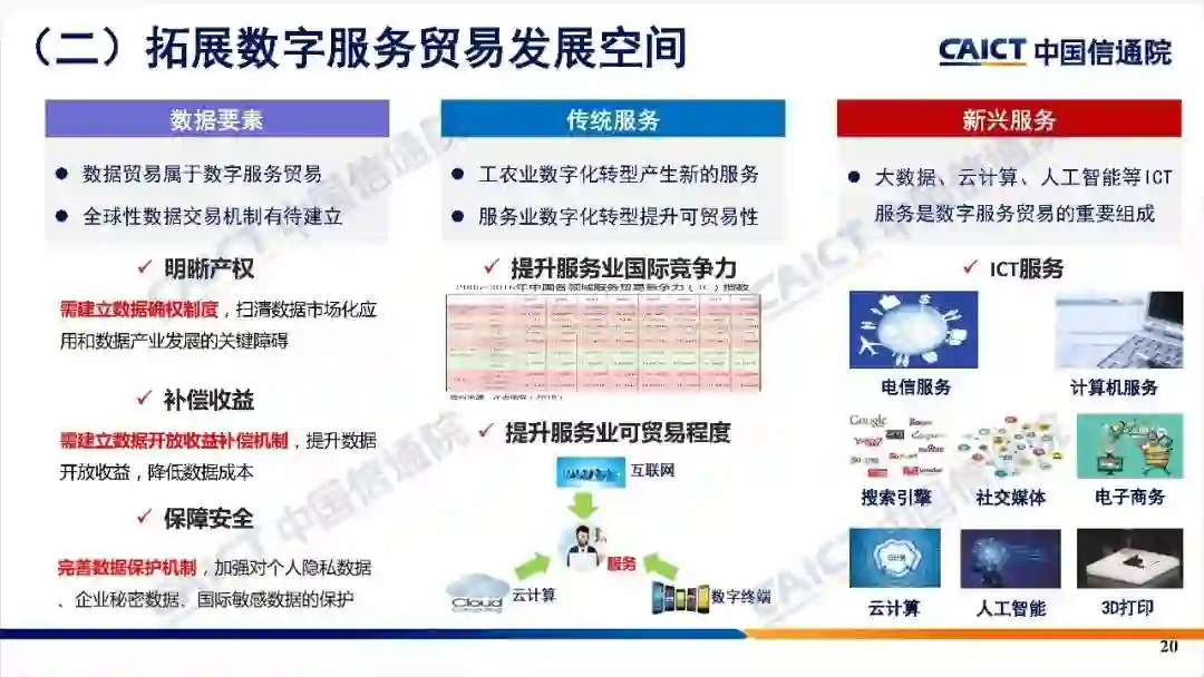 二是拓展数字服务贸易发展空间。从数据要素贸易看,需要明确可贸易数据范围,落实数据应用规则,完善敏感数据保护,构建数据补偿机制。从传统服务看,需要加快数字化转型,进一步提升服务领域的可贸易性。从新兴服务看,需要加强大数据、云计算、人工智能等关键技术产业的创新创业,培育核心竞争力。