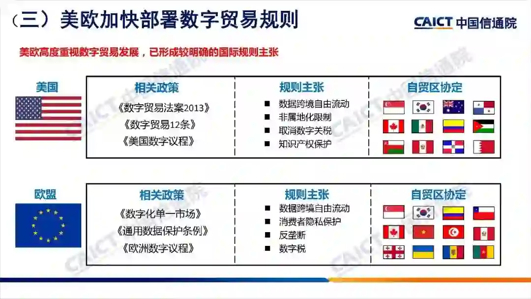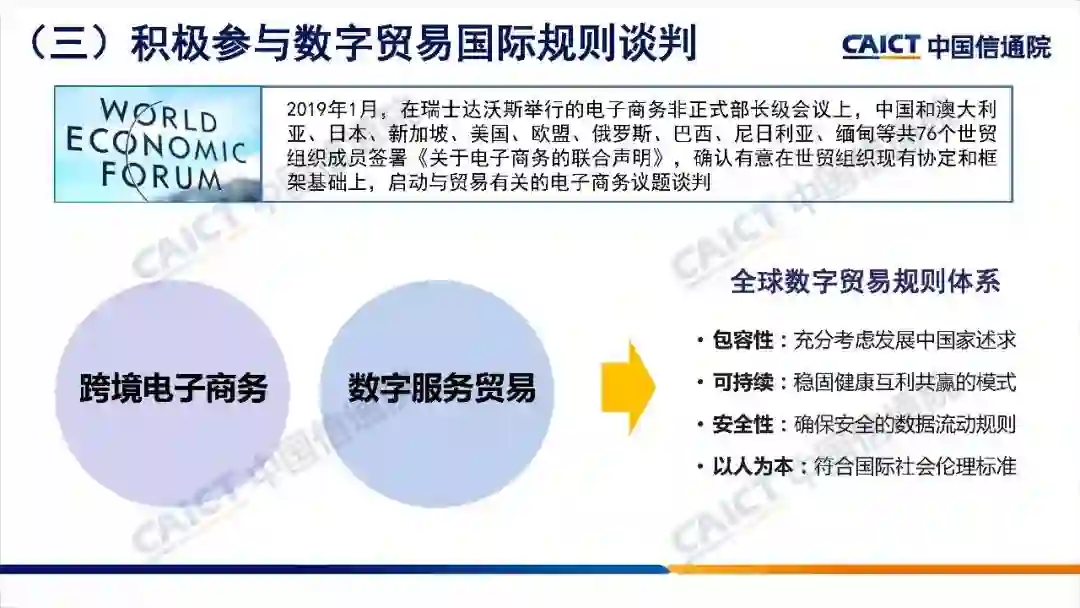 三是积极参与数字贸易国际规则建设。数字贸易会带来深刻的变革,使得分工、分配模式发生巨大变化,需要构建一套包容、可持续、安全和以人为本的跨国治理体系,使得发展中国家也能广泛参与到以数字贸易为核心的全球化浪潮中。