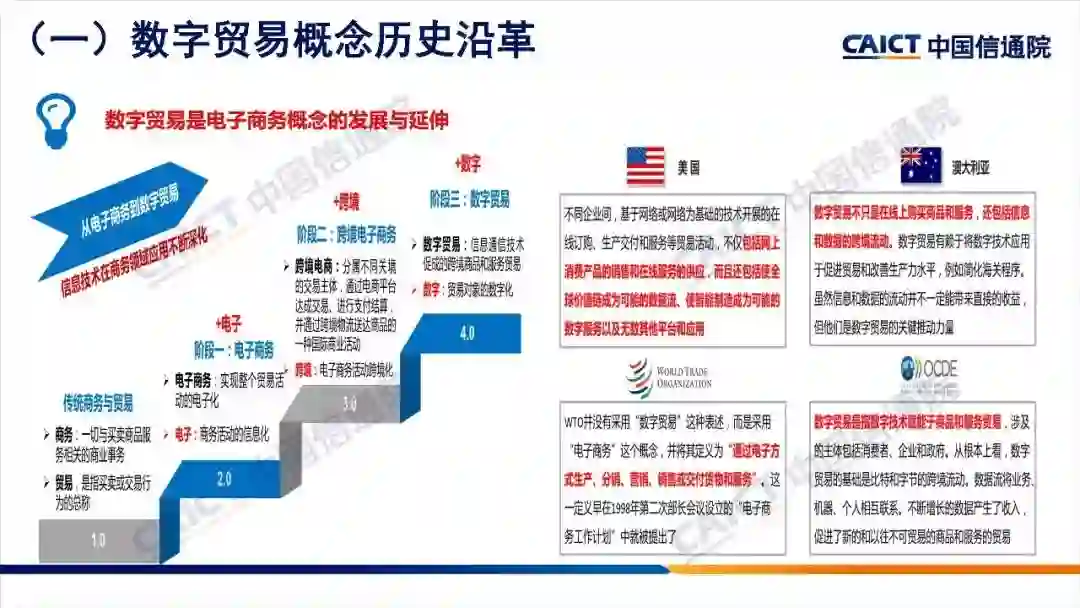 目前,国际上对数字贸易尚没有形成统一认识,美国、澳大利亚、OECD都提出了各自看法,WTO对数字贸易的讨论仍是在电子商务议题下开展的。