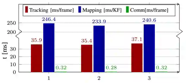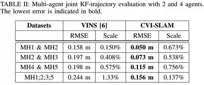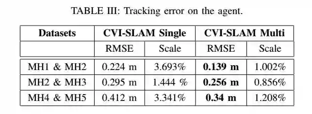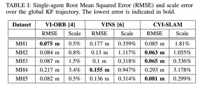 作者提出的CVI-SLAM Agent使用视觉-惯性传感器,由于各个agent传感器的互补性,能够进行度量尺度估计和重力对准用于估计轨迹跟踪和建图,与单目SLAM相比具有更高的定位精度和鲁棒性。作者分六部分系统整体结构、误差残差建模、VIO、通信、冗余检测与消除和循环与地图融合构建CVI-SLAM系统并讨论CVI-SLAM的通讯带宽需求及其对Agent数量影响。最后在无人机公共数据集的上评估了具有1到4个Agents的场景下的CVI-SLAM运行速率及误差。