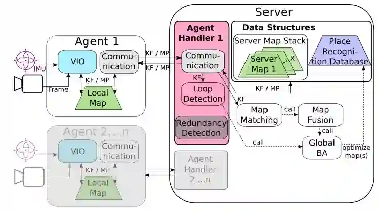 通过通讯接口在Agent和服务器之间交换关键帧(KF)和地图点(MP)。Server具有高性能计算器运行计算量比较大的且实时性要求不高的任务如:冗余检测,回环检测,地图融合,和束约束。