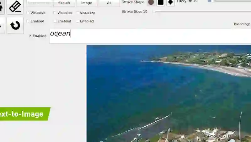 使用GauGAN2,用户可以生成一个分割图(segmentation map),能够显示场景中物体位置。用户可以将生成的图像切换到绘图模式,用天空、树、岩石和河流等标签将场景绘制成粗糙的草图,并能够使用画笔将涂鸦嵌入图像中。