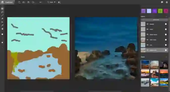 NVIDIA canvas也提供了多种材料可供使用。NVIDIA画布有九种风格,修改的外观和感觉的绘画和15种不同的材料,从天空和山脉,河流和石头。在不同的图层上绘制,使元素保持分离。从头开始,或启动和修改应用程序的预制场景之一,以获得更完美的灵感提示。