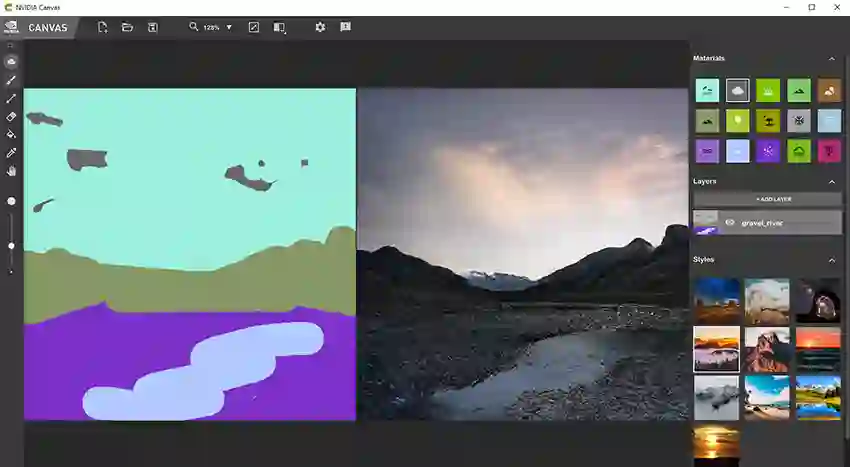 另一个GauGAN的应用是Nvidia Canvas,能够让创作者通过材料而不是颜色来绘画。这个程序能够实时现实绘画结果,而不需要等待完整的绘画。
