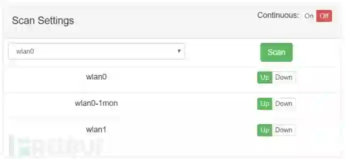 从下拉列表为扫描的持续时间,增加扫描时间可以在每个信道上看到更多潜在的流量,选中“Continuous”框将启用正在进行的扫描。每隔一段时间进行持续扫描,并更新扫描结果列表,直到扫描停止