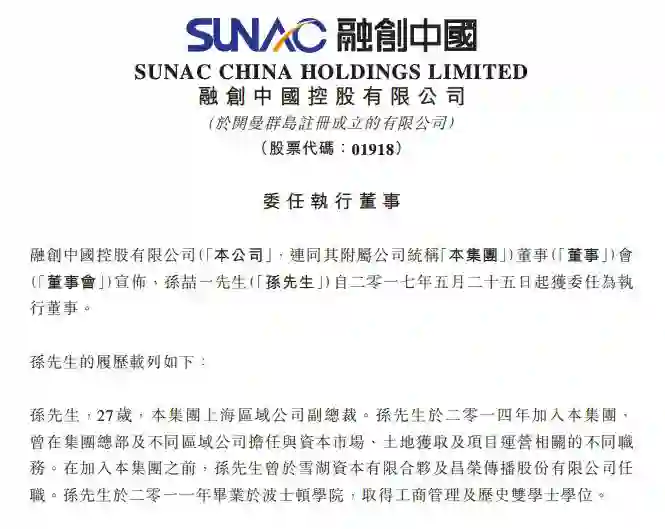 融创中国于港交所发布公告,表示时年27岁的孙喆一将出任融创中国董事会执行董事,标志着他正式迈入融创核心高管层。公告中提到,孙喆一的年薪为约120万元人民币。