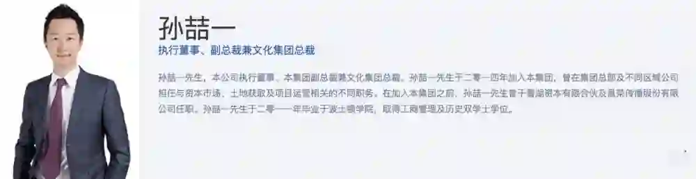 融创中国官网显示,孙宏斌长子孙喆一担任融创集团旗下融创文化集团的总裁一职。目前,孙喆一的职务已被更新为“执行董事、副总裁兼文化集团总裁”。公开资料显示,孙喆一现年29岁。