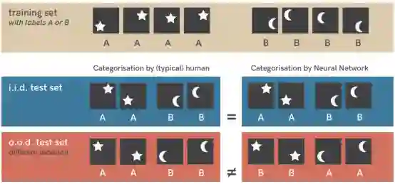 举一个例子,当在简单的星月数据集上训练时(顶行),标准的神经网络(三层,完全连接)可以轻松地对新的类似样本(数学上称为i.i.d.测试集)进行分类。但是,在稍有不同的数据集(o.o.d.测试集,最下面一行)上对其进行测试揭示了一种捷径策略:网络已学会将对象位置与类别相关联。在训练过程中,星星总是显示在图片的右上角或左下角;月亮则显示在左上角或右下角。这种模式仍然存在于来自i.i.d.测试集(中间一行)的样本中,但在o.o.d.测试图像(下排)中不存在,从而暴露了捷径现象。这里最重要的一点是,在训练设置约束下,位置和形状都是有效的解决方案,因此,没有理由期望神经网络更喜欢其中一个。然而,人类具有使用物体形状的强烈直觉。就像这个例子看起来那样,对抗性例子,偏向机器学习模型,缺乏领域通用性和输入略有变化引起的失效等都可以理解为捷径学习现象的实例。