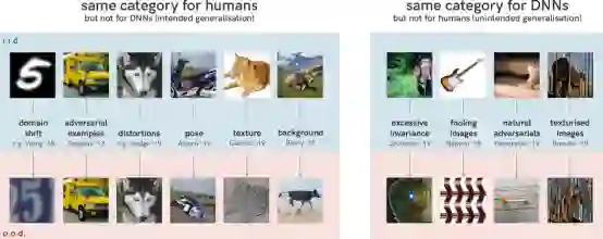 这种行为所引起的后果,是神经网络泛化能力的失败。下图左侧是人们期望模型进行泛化的几个方向。不管是手绘的黑白的还是彩色的门牌号,5都是5。同样,在姿态、纹理或背景上的轻微变形或变化也不会影响我们对图像中主要对象的预测。相比之下,DNN很容易被欺骗。有趣的是,这并不意味着DNN完全不能泛化:事实上,在对人类几乎没有意义的方向上,它们还是可以很好地泛化。下图的右侧显示了一些例子,从一些可理解的(置乱图像以仅保留其纹理)到完全不可理解。