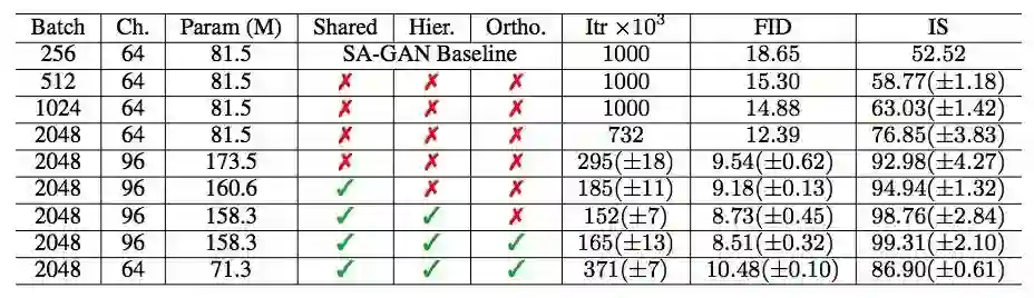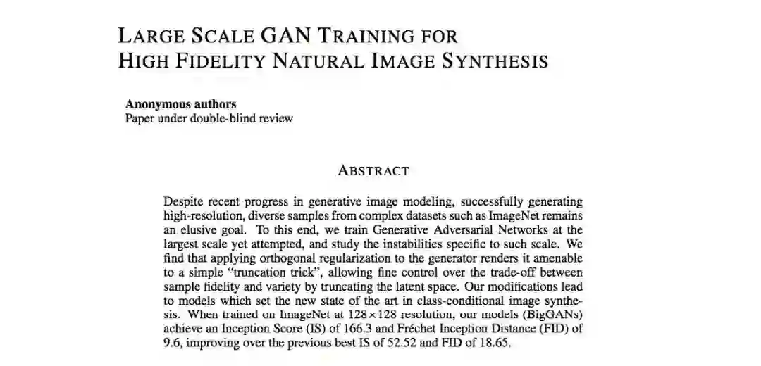 证明GAN能从大规模训练中受益。通过对体系结构做了两个简单修改,他们在训练过程中使用的参数量是现有研究的2-4倍,batch size是8倍,但模型性能有显著提高。