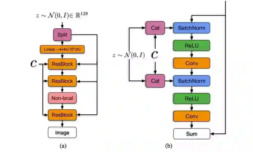 本文提出的BigGAN遵循了SAGAN的基本架构,它基于ResNet,但判别器D中的通道和一般ResNet不同,每个模块的第一个卷积层的filter数量等于输出的filter数,而不是输入数。