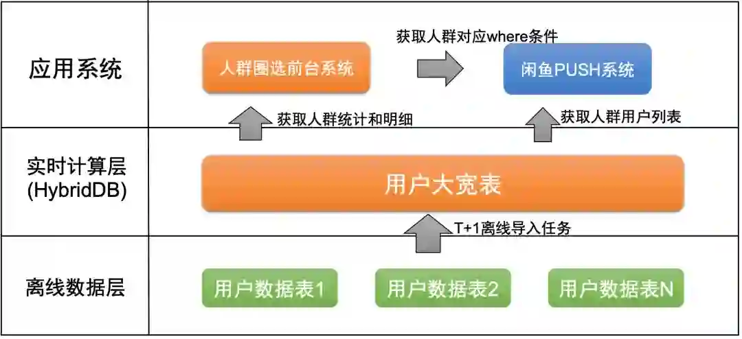 实时计算层:根据人群的筛选条件,从用户大宽表中,查询符合的用户数量和用户 ID 列表,为应用系统提供服务。