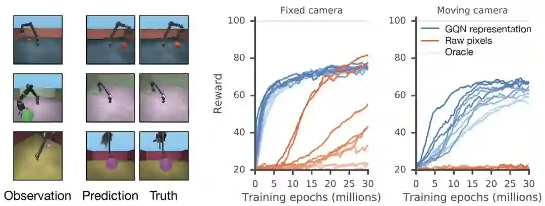 GQN的表示允许稳健的、数据有效(data-efficient)的强化学习。当给定GQN的紧凑表示时,与无模型基线agent相比, state-of-the-art的深度强化学习agent能够以更高的数据效率方式完成任务,如下图所示。对于这些agent,生成网络中编码的信息可以被看作是对环境的“先天”知识: