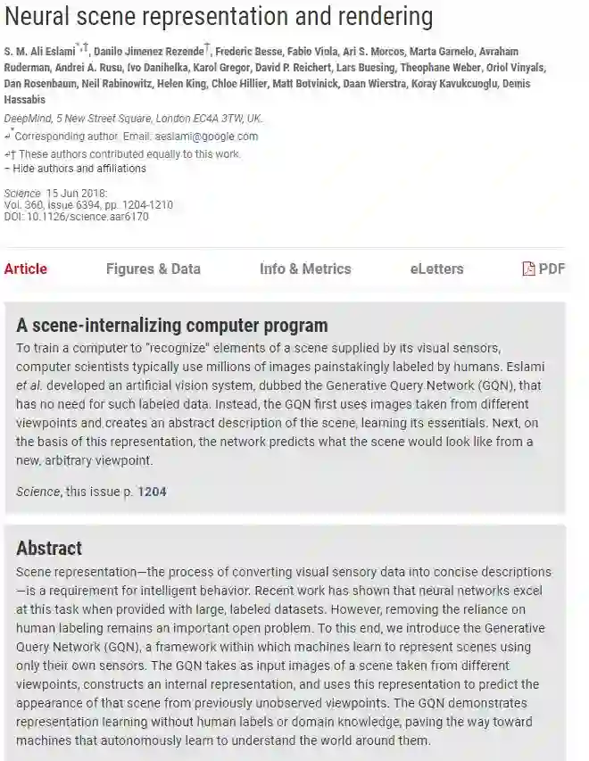 DeepMind的这套视觉系统,也即生成查询网络(GQN),使用从不同视角收集到的某个场景的图像,然后生成关于这个场景的抽象描述,通过一个无监督的表示学习过程,学习到了场景的本质。之后,在学到的这种表示的基础上,网络会预测从其他新的视角看这个场景将会是什么样子。这一过程非常类似人脑中对某个场景的想象。而理解一个场景中的视觉元素是典型的智能行为。