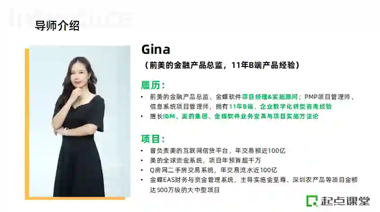这是由起点课堂出品的B端产品公开课,专为正在做B端产品同学,或者对B端产品感兴趣想要了解相关工作内容的同学打造,课程将由前美的金融产品总监@Gina直播授课。