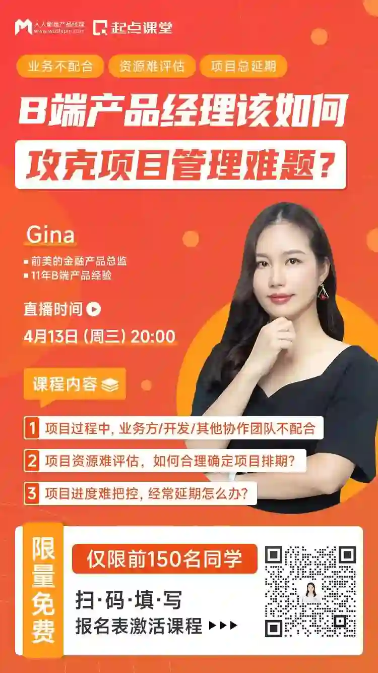 为了帮助大家更好的了解项目管理难的原因和要点,并提前做好应对的准备。人人都是产品经理社区&起点课堂特邀前美的金融产品总监@Gina,用1个小时的时间,跟大家分享项目管理的3大技巧~更有1v1现场答疑互动等你来!