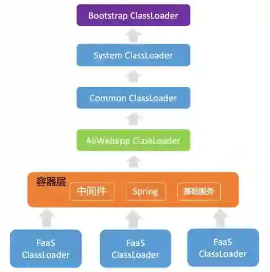FaaS平台提供二三方JAR包的加载能力,允许在不重启整个底层容器的情况下,加载函数自己的二三方依赖,我们通过实现Groovy二三方JAR包加载能力的Classloader,实现了函数与函数之间、函数不同版本之间的二三方依赖加载能力。FaaS平台的Classloader体系: