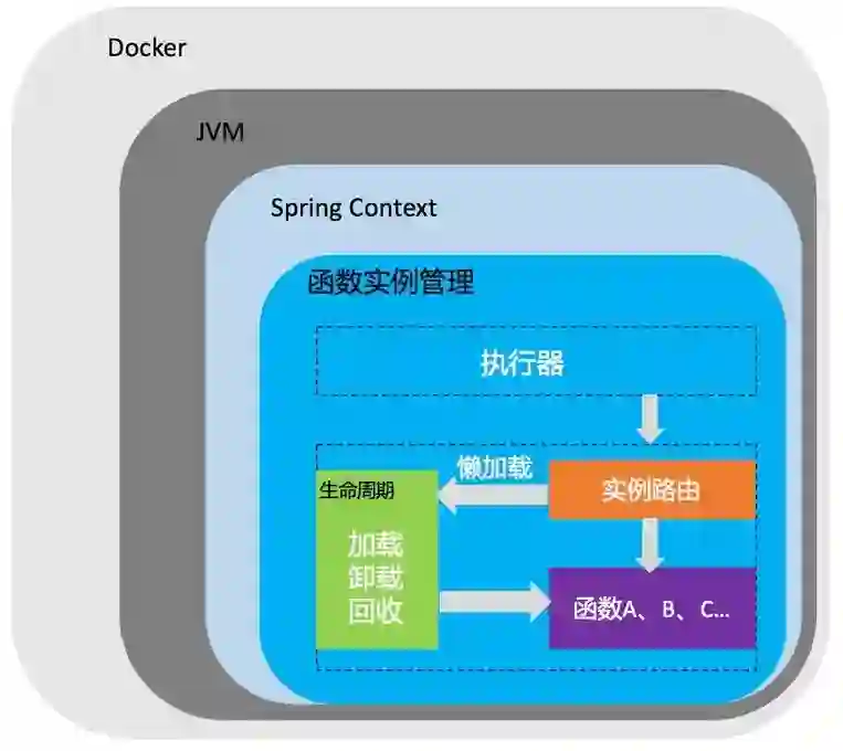 函数容器层是整个系统的核心,主要通过函数执行引擎进行实例的调用执行,同时负责函数实例的生命周期管理,包括按需加载、代码预热、实例卸载回收等工作。