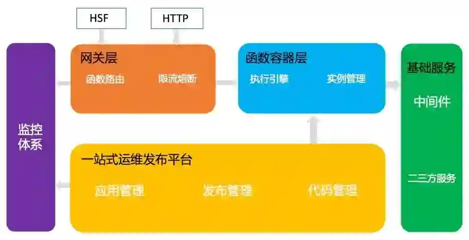 FaaS平台的整体核心架构主要由网关、运行时容器、一站式运维发布平台、基础服务等组成: