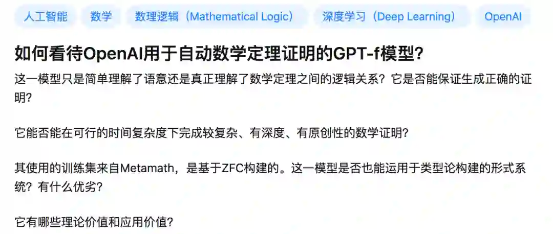 此外,文摘菌也翻了一下知乎,只有一个相关问题,而且该问题下只有一个回答。由此可见,国内网友可能还不太知道 GPT-f,也可能由于发布时间并不长,大家对于GPT-f 还处在比较懵的状态。