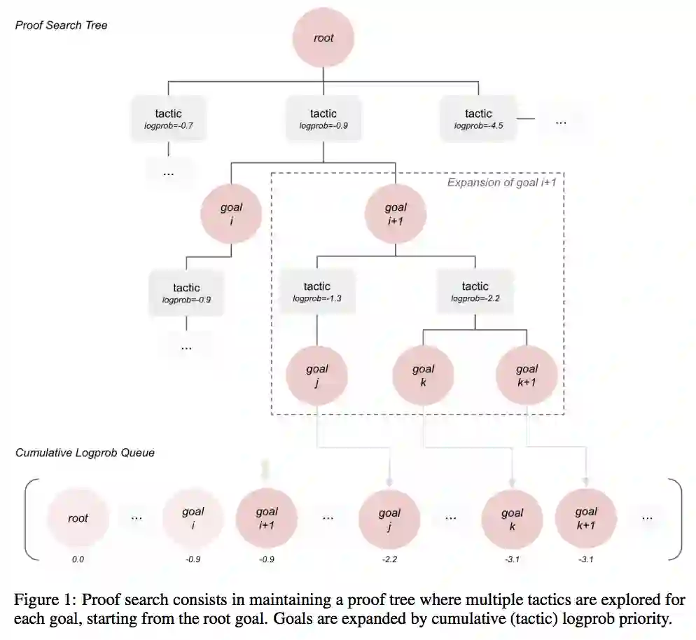 证明搜索包括维护一个证明树,其中从根目标开始探索每个目标的多种策略。