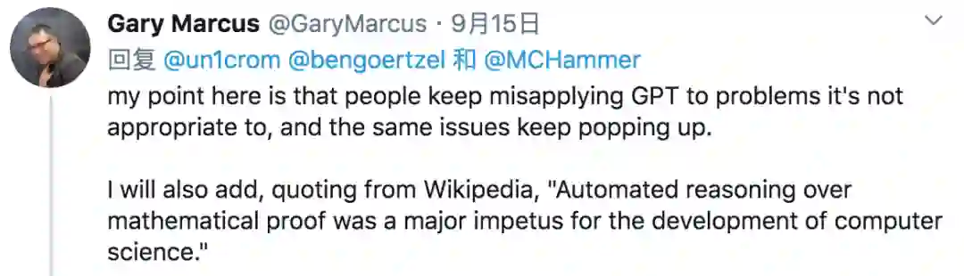 Robust.AI、Geometric Intelligence 两家 AI 公司的创始人,研究人工智能领域多年的科学家 Gary Marcus 认为,“就像 GPT-3 不是研究真正人类语言的正确方向一样……, GPT-f 并不是达到真正人类水平 (更不用说超越人了) 的数学定理证明的正确研究方向。”