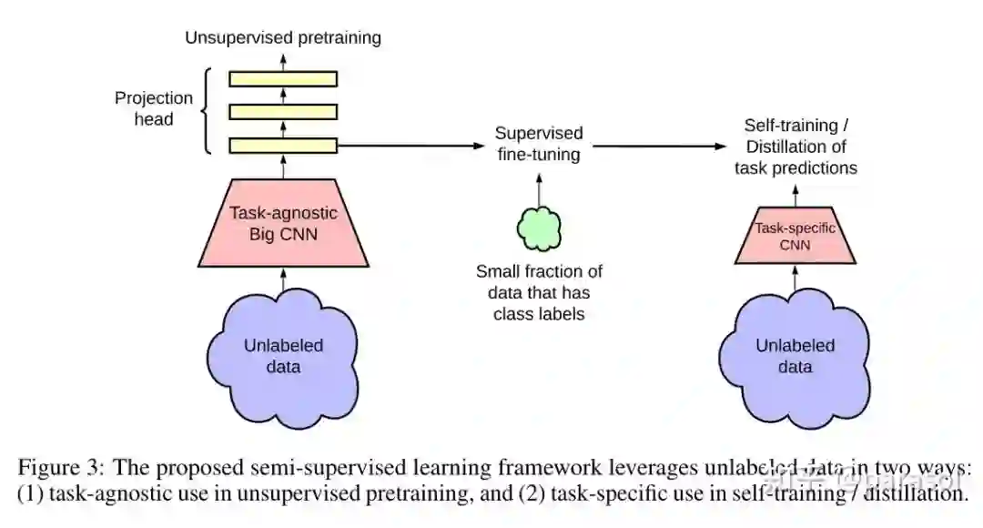 Pretraining:用了 SimCLR,然后用了更深的 projection head,同时不是直接把 projection head 丢了,而是用 projection head 的 1st layer,来做后面的 fine tune。。。(这也太 trick 了吧)
