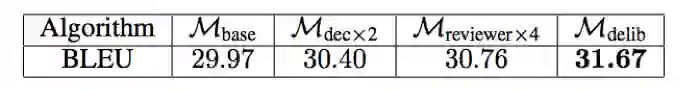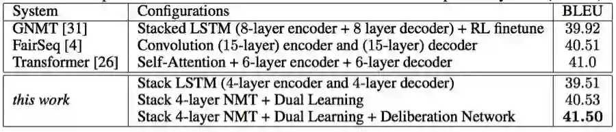 (1)神经机器翻译(NMT),即使用神经网络来将源语言的句子翻译到目标语言[1, 33, 32, 34]。标准的 NMT 模型由一个编码器(用于编码源句子)和一个解码器(用于生成目标句子)组成,因为可以使用我们提出的推敲网络加以改善。在 WMT' 14 [29] 英语→法语数据集上基于广泛应用的单层 GRU 模型[1] 上实验结果表明:相比于没有使用推敲的模型,使用推敲可以将 BLEU 分值[17]提升 1.7。我们还在汉语→英语翻译上应用了我们的模型,并且在 4 种不同的测试集上平均实现了 1.26 的 BLEU 提升。此外,在 WMT' 14 英语→法语翻译任务上,通过将推敲应用于深度 LSTM 模型,我们实现了 41.50 的 BLEU 分值,这个成绩是这一任务的全新纪录。