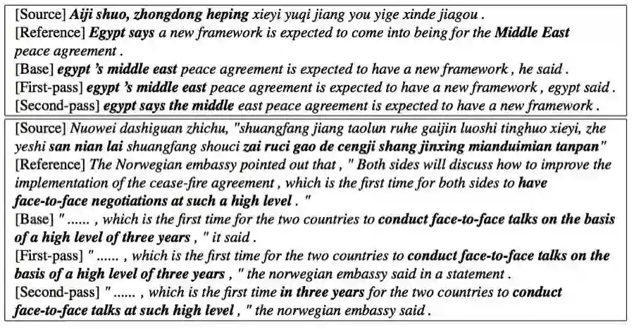 在这项研究中,我们提出了用于序列生成任务的推敲网络,其中会使用一个第一阶段解码器来生成一个原始序列,然后再使用一个第二阶段解码器来润色这个原始序列。实验表明我们的方法在机器翻译和文本摘要任务上可以实现比几种基准方法远远更优的结果,而且我们的方法还在 WMT' 14 英语→法语翻译任务上实现了新的单个模型的当前最佳结果。