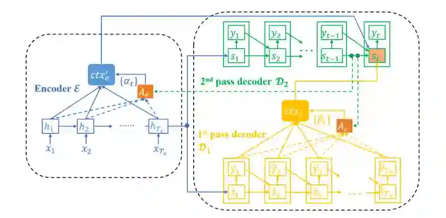 尽管该框架已经取得了很大的成功,但还存在一个问题:在生成词的时候只能利用生成的词而不是未来的尚未生成的词。也就是说,当解码器生成第 t 个词 y_t 时,只使用了小于 t 的 y,而没有明确考虑大于 t 的 y。相反,真实的人类认知过程会以一种迭代式刷新的方式利用包含过去和未来部分的全局信息。这里给出两个例子:(1) 思考一下当我们在阅读一个句子时在句子中间遇到了一个不认识的词。我们不会在此就停止阅读。相反,我们会继续读完这个句子。然后我们回到这个未知词并试图使用其上下文(包括该词之前和之后的词)来理解它。(2)在书写一份好的文档(或段落、文章)时,我们通常首先会创建一个完整的草稿,然后再根据对整个草稿的全局理解来进行润色。当润色一个特定部分时,我们不会只看这部分之前的内容,而是会考虑这个草稿的全局,从而评估这里的局部元素与全局环境的契合程度。