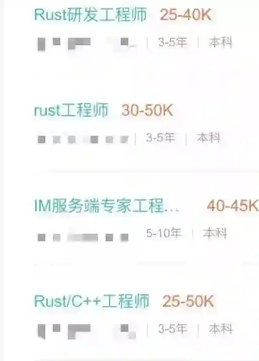 国内对于 Rust 的招聘需求并不旺盛,可搜寻到的岗位不到 Go 语言的十分之一,只比 Clojure 好一些,基本是规模较大的企业对此才有招聘需求,比如今日头条、滴滴等,给出的薪资倒是还算优厚,月薪基本集中在 25k 人民币以上。