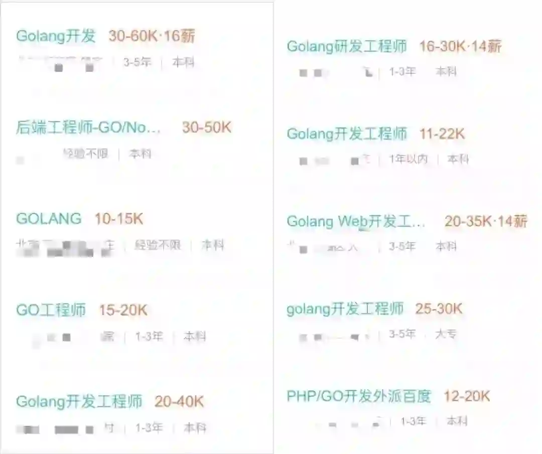 国内整体的薪资水平要略低于全球,需求量较大的依旧是 Java、Python 这类语言。如果与全球薪资较高的编程语言比的话,如果对国内主流招聘网站进行统计,以“Go 语言”为关键字在全国范围搜索,热门地区(北上广深等需求量较大的城市)月薪基本集中在 15-30k 人民币之间,一线互联网大厂的薪酬确实更具竞争力,比如 BAT、高德、奇虎 360、滴滴等,不仅给出的月薪更高(25-60k 之间浮动),不少还明确标出可以给 14 至 16 个月的薪水,而所要求的工作经验基本都在 3 到 5 年。