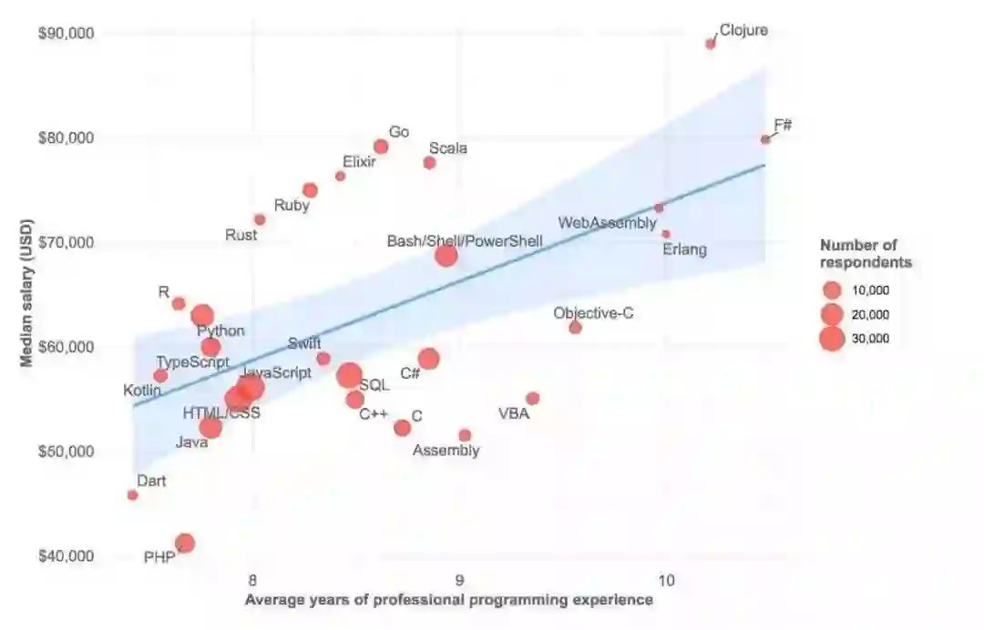 不难看出,使用 Clojure、F#、Scala、Go、Rust 和 R 语言的开发人员,虽然工作经验并不见得非常多,尤其是 Rust、R、Ruby 和 Go,也会获得不少的薪水。然而,PHP、Java、C、C++,即使有多年开发经验,薪水也很难有比较高的提升。