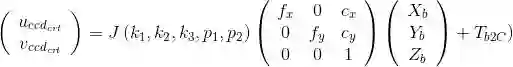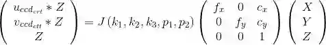 针孔相机模型中,只要确定这9个参数就可以唯一的确定针孔相机模型, ,这个过程就称为「相机标定」,其中前4个我们称为内参数,后5个称为畸变参数,畸变参数是为了补充内参的。所以一旦相机结构固定,包括镜头结构固定,对焦距离固定,我们就可以用这9个的参数去近似这个相机。这里说的「镜头结构固定」,按我个人的理解,除了焦距固定之外,也应当包含光圈固定,因为改变光圈的大小,除了景深之外,是有可能改变针孔相机模型中的光心位置,但是影响并不是很大。这意味着标定好的相机如果改变光圈大小,会使得标定误差变大但应该不会大到难以接受的地步。对于针孔相机本身需要拟合的方程如下: