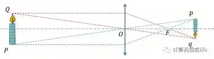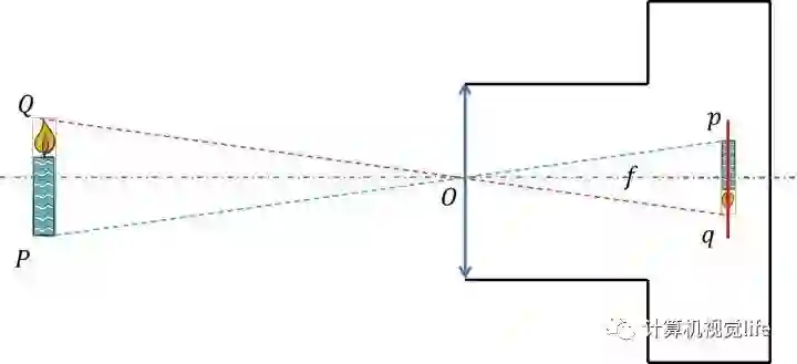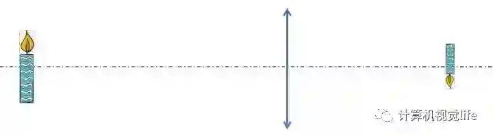 这里说的等效,只是针对物像共轭关系的等效,也就是光路的等效,镜头中之所以用了形态各异的透镜主要是为了消除各种各样的像差,提高清晰度。换句话说,等效透镜的目的绝不是为了在实际应用中取代镜头(毕竟一个镜头都好贵),只是为了帮助我们理解。这样我们就可以画出相机拍摄到清晰的蜡烛燃烧场景的草图,如下图。
