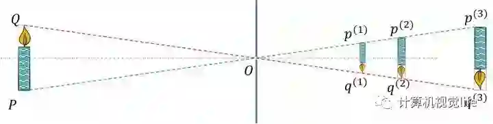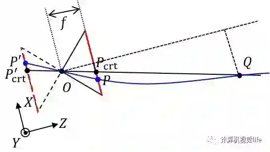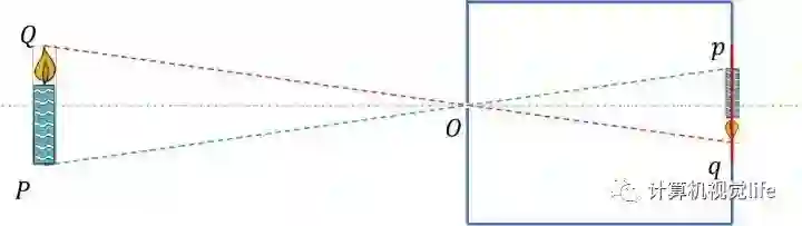但是我们说的是简化后的相机模型和针孔相机的成像原理仅仅是相似,绝不能等同,由于针孔相机的原理是光沿直线传播,所以真实的针孔相机是没有「焦距」的概念的,也不存在像差,其物像关系不具有一一对应性,如下图。